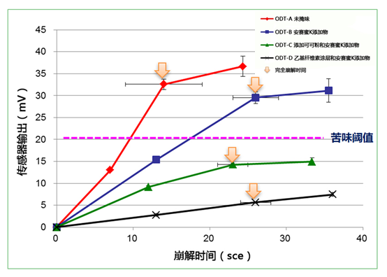 從圖中可見,“未掩味”苦味最強,崩解過程中苦味迅速釋放,添加掩味劑后均可抑制口崩片的崩解苦味的釋放,但不同掩味劑的掩味效果是不同的。單純使用安賽蜜(ODT-B)掩味效果不佳。ODT-C和D的掩味效果很好,即使在100%崩解后呈現(xiàn)出來的苦味強度仍低于閾值。