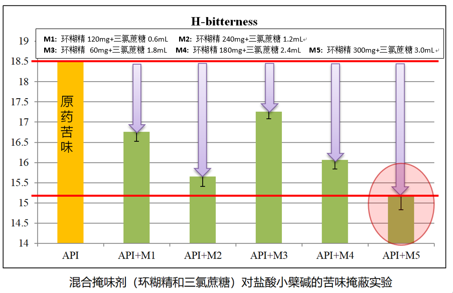 通過API實驗找出電子舌測試鹽酸小檗堿最佳的濃度。在此濃度基礎(chǔ)上添加混合掩味劑(M1~M5)。從柱形圖中可以看出,添加抑制劑之后,所有樣品的苦味均有所降低,下降最多的是API+M5,其次是API+M2、API+M4,抑制效果最不明顯的是API+M3。從配方上看,M3的β-CD量最少,且三氯蔗糖量也不是最多的,綜合抑制效果最弱。