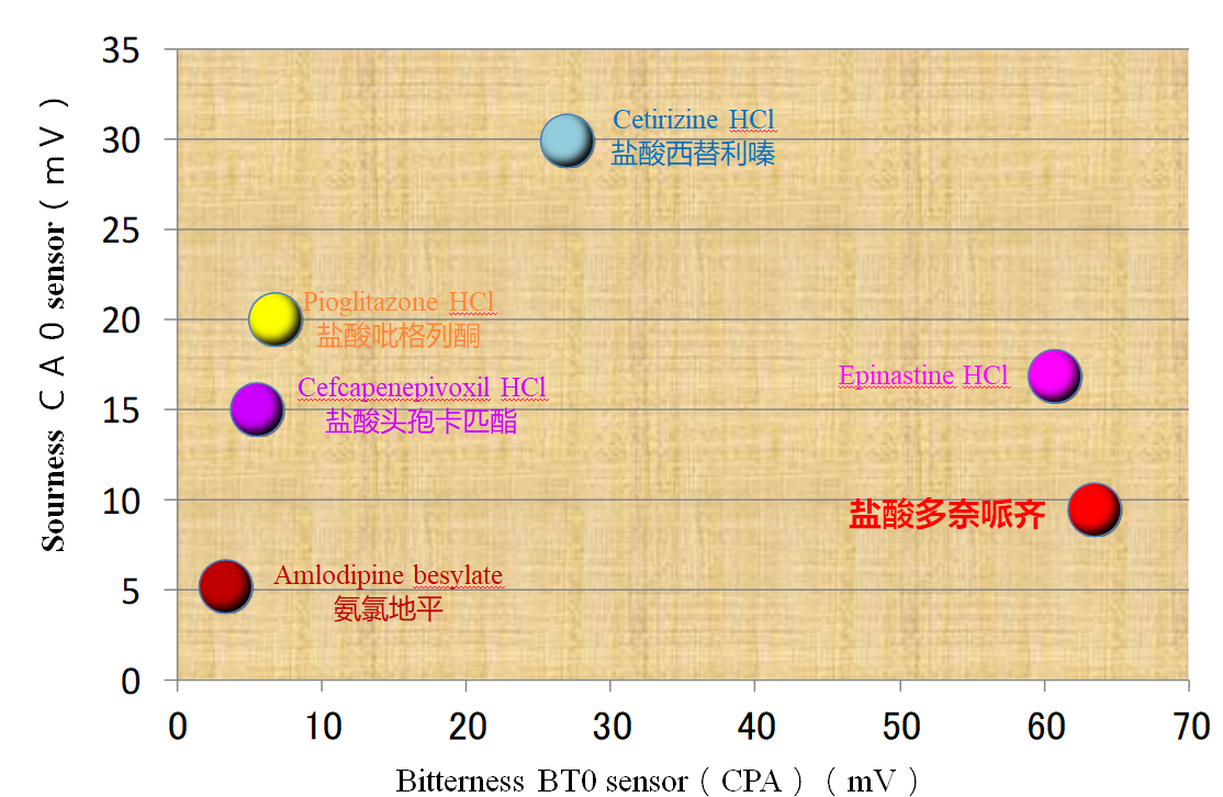 對幾種鹽酸鹽類藥物的苦味和酸味進行測試可見:本次要測試的目標樣品“鹽酸多奈哌(pai)齊”的確是具很強的苦味,其苦味值明顯高于另外幾種鹽酸鹽類藥物。