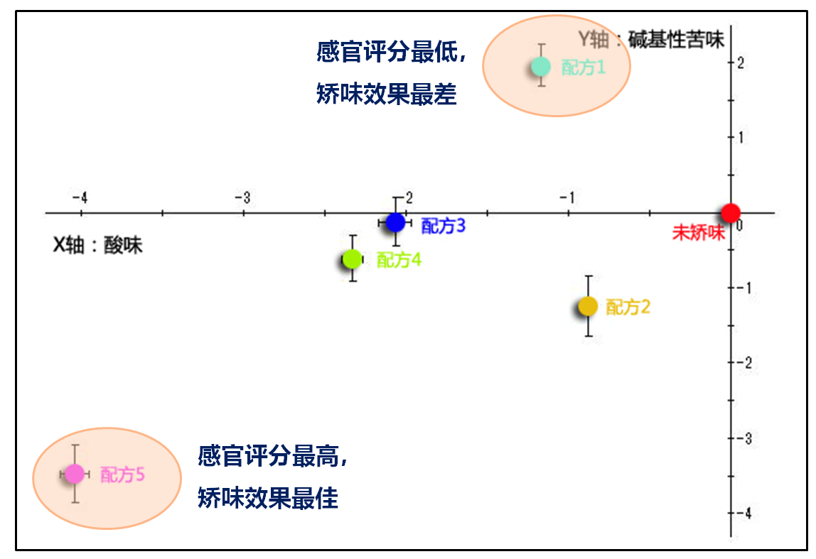 選擇三氯蔗糖和檸檬香精作為矯味劑,樣品標記配方為1~5為不同配比的三氯蔗糖和檸檬香精。測試結(jié)果顯示,未矯味和不同配方的產(chǎn)品在味道上存在明顯的差異,以未矯味為參照,將酸味和堿基性苦味單獨比較可見,配方1的酸味和堿基性苦味較強,故而其矯味效果最差,配方5有效的降低了不良的酸味和苦味,其矯味效果最好,其結(jié)果與感官評價也是一致的。