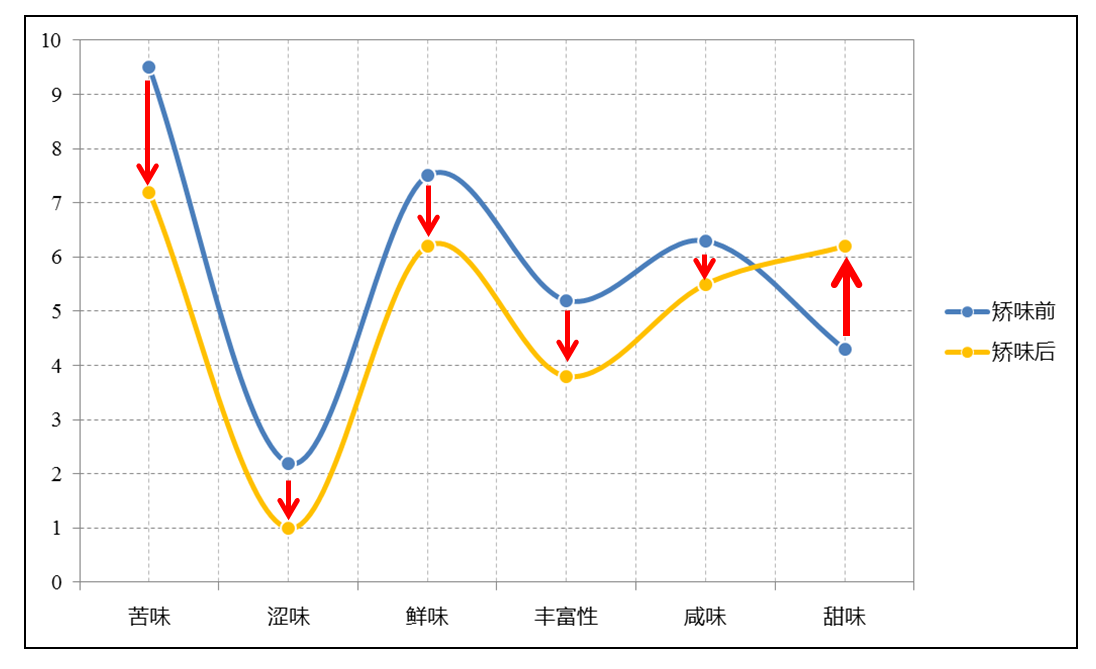 某中藥口服液矯味后中藥口服液的苦味、苦味回味、咸味、鮮味和豐富性均明顯降低;而且矯味后口服液的甜味明顯增大。一般中藥的苦味和苦味回味是其不良的口感,可見通過矯味可有效降低口服液的苦味,增加甜味,使得口服液的口感更加友善。