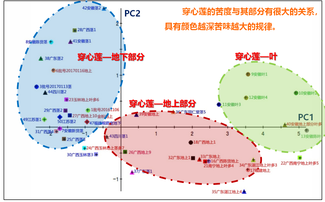 樣品信息:“綠色” 穿心蓮葉片、“紅色” 穿心蓮地上、部分“藍色” 穿心蓮莖(地下部分)。本次測試的樣品有不同產(chǎn)地,不同年份、不同批次的穿心蓮樣品50個,通過實驗可見通過PCA主成分分析可見不同部分是可以通過味道區(qū)分開來的。另外結(jié)合傳感器貢獻率表可知,苦味由大到小的順序是:葉片>地上部分>地下部分